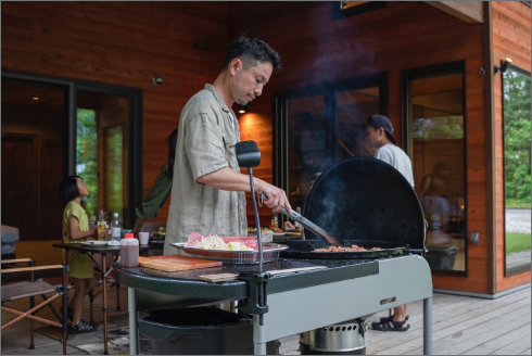 里山の下で楽しむ、贅沢なアウトドアBBQ。Weber製のグリルをはじめ、必要なアイテムがすべて揃った安心のレンタルプランです。